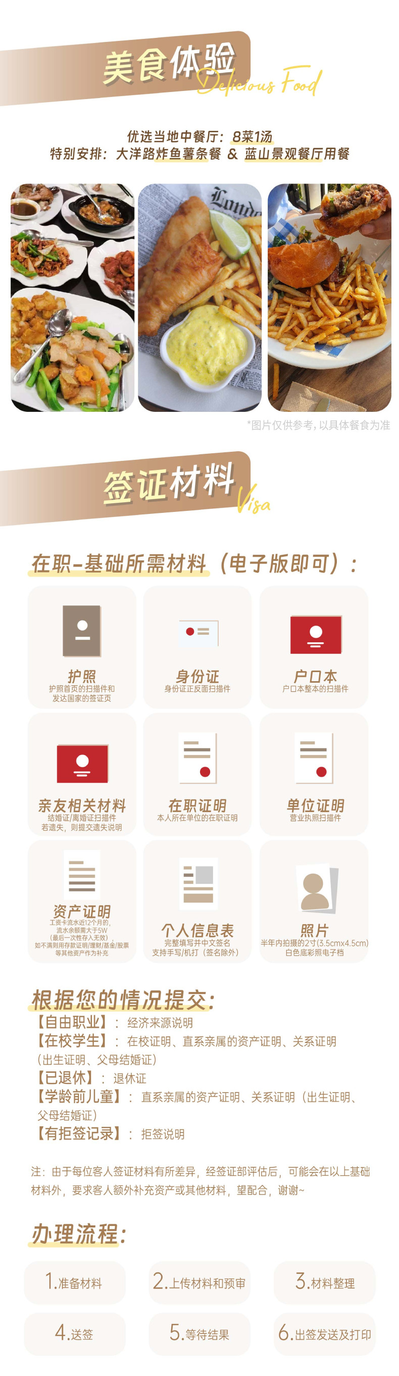 在办理签证/签注期间,我司会根据您的材料情况可能要求增补其他材料、担保金/押金(仅限通过第三方银行资金托管,不以现金或转账方式直接收取)或予以劝退,若因劝退产生损失由旅游者自行承担,敬请谅解