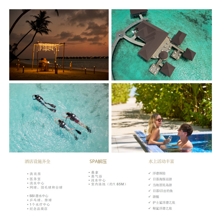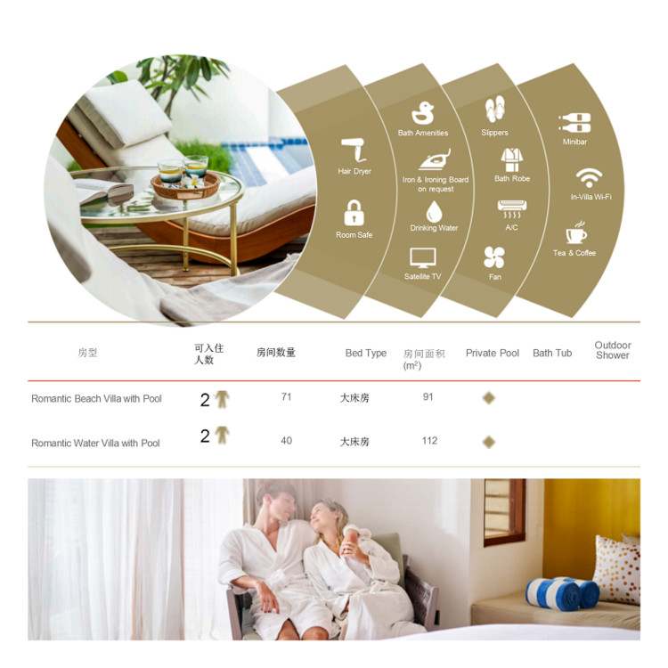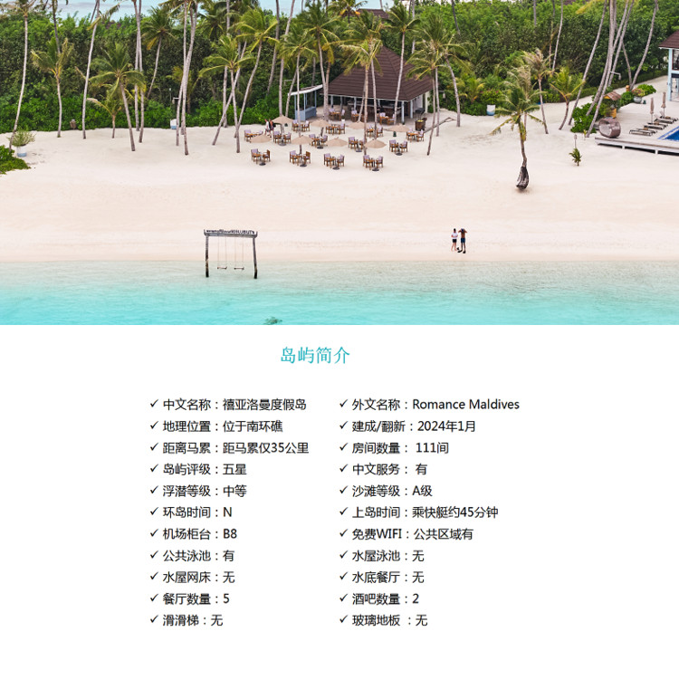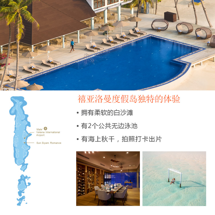 3. 住宿:马尔代夫禧亚洛曼 岛2晚泳池沙屋Romantic Beach Villa with Pool +2晚泳池水屋 Romantic Water Villa with Pool 。